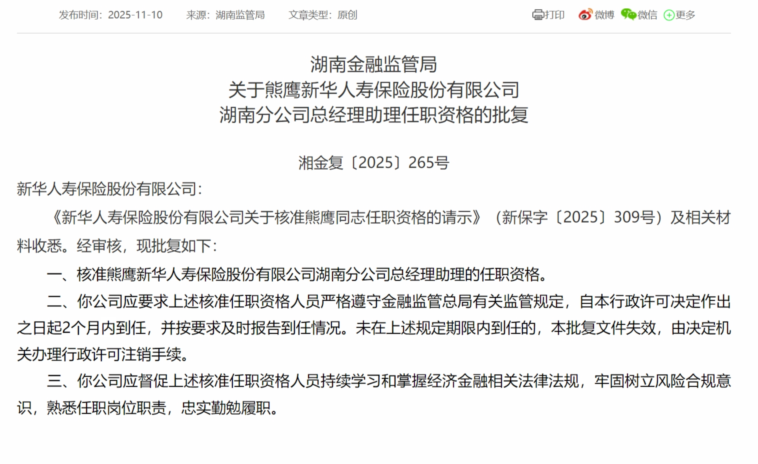 10倍杠杆配资 熊鹰获批担任新华人寿湖南分公司总经理助理