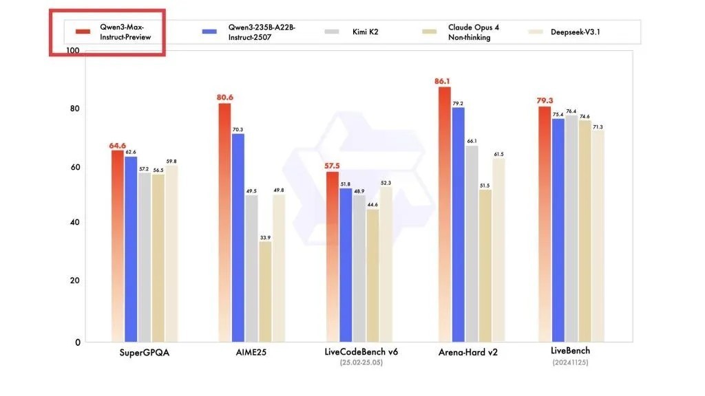 官方测评显示,Qwen3-Max-Preview一登场,不仅比自家前一代最强模型Qwen3(235B)更强,而且还打败了包括Claude Opus 4在内的国内外劲敌