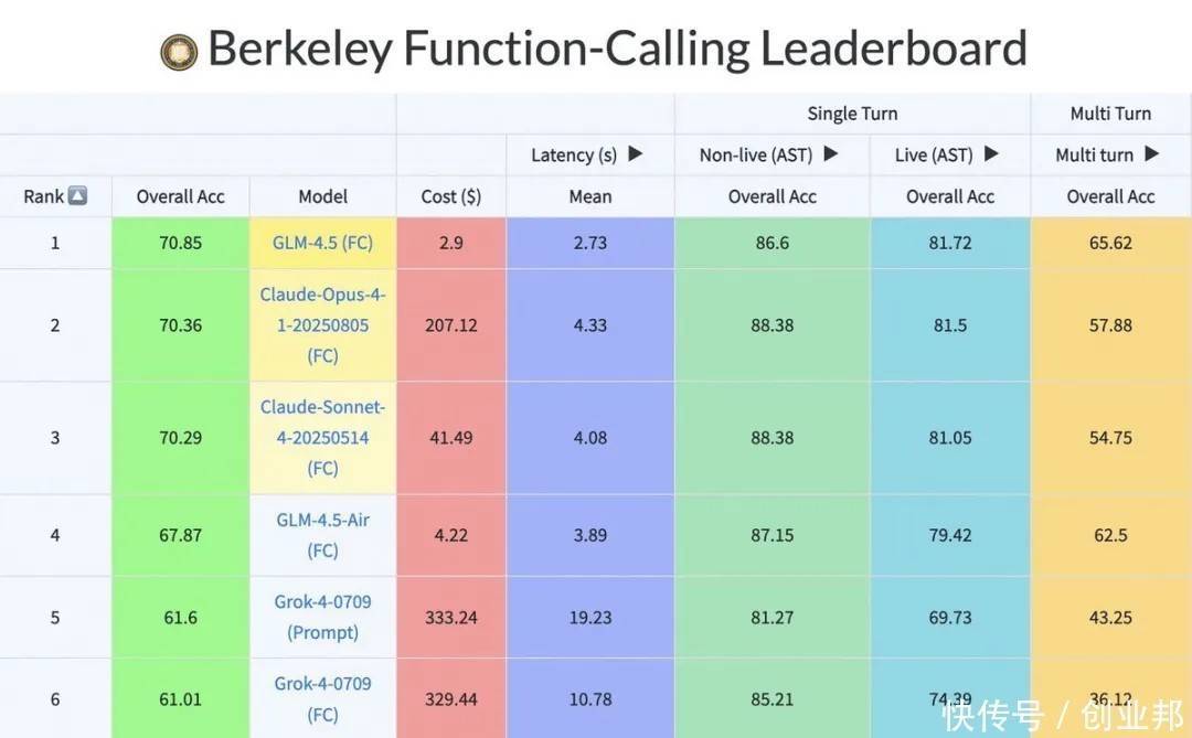 测试显示,开源模型GLM-4.5在伯克利工具使用榜单上超越Claude Opus 4.1,运行相同任务成本仅为1.4%