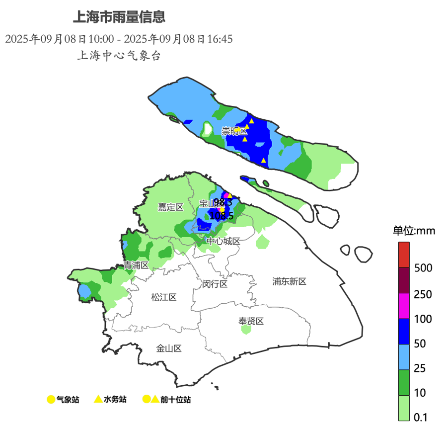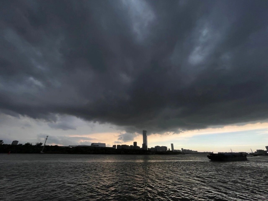 午后雷阵雨这一高温“搭档”也未缺席。强降水云团进一步向东南方向发展,并激发出本地对流,今天下午申城出现雷暴云团云底粗糙的弧状云,带来满满的压迫感,全市一度四黄警(雷电黄色预警、暴雨黄色预警、大风黄色预警、冰雹黄色预警)高挂,宝山杨行镇一个小时降下了112.5毫米的雨。