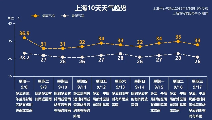 受副热带高压控制,申城晴热天气仍在继续。根据上海中心气象台发布的数据,今天市区徐家汇站最高气温为36.9℃,为今年第49个高温日。